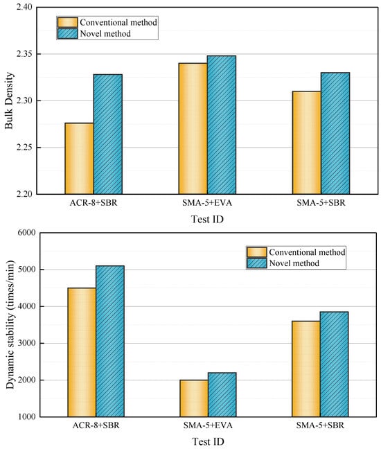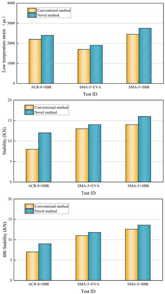 The emulsified asphalt mixtures mentioned above were prepared using both conventional and novel mixing processes, respectively. Each group contains 4 specimens. A comparative analysis of their technical properties was conducted, and the corresponding test results are presented in Figure 4.