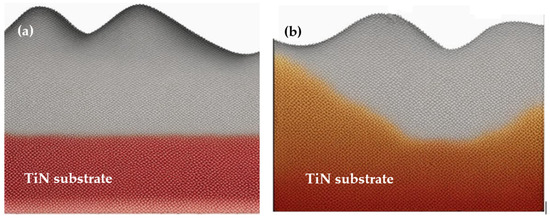 - Namakian, R.; Novak, B.R.; Zhang, X.; Meng, W.J.; Moldovan, D. A combined molecular dynamics/Monte Carlo simulation of Cu thin film growth on TiN substrates: Illustration of growth mechanisms and comparison with experiments. Appl. Surf. Sci. 2021, 570, 151013. [Google Scholar] [CrossRef]