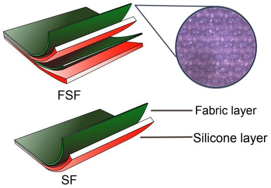 Figure 1 shows the textile–silicone composite specimens, which are prepared as a two-layer structure (SF) and four-layer structure (FSF). SF was composed of a layer of silicone with a thickness of 1 mm or 2 mm, and a layer of powernet material. FSF has two powernet layers of which one is fully embedded inside the 0.5 mm or 1 mm silicone material. Hence, the specimens are prepared in 2- and 4-layer structures, respectively, while each layer of silicone material is prepared with a thickness of 0.5 mm, 1 mm or 2 mm, respectively. A total of eleven samples were prepared for the mechanical comparison (Table 2).