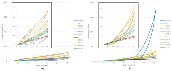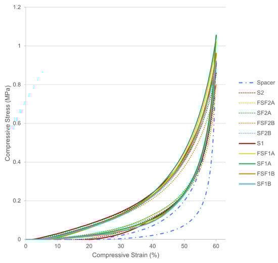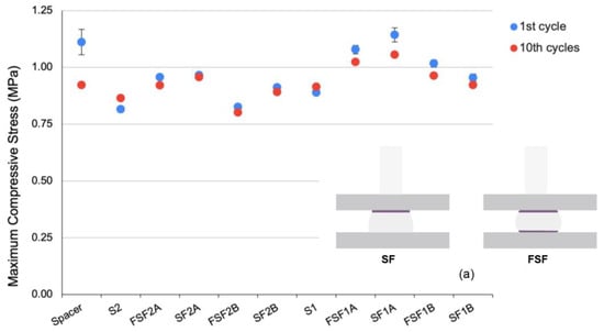 No significant difference was found among all of the samples for the maximum compressive stress in terms of different structures, thickness and types of fabrics. With reference to the stress and strain curves in Figure 3, the compression properties of all of the samples are observed to be non-linear. The textile–silicone composites have a higher maximum compressive stress and require higher forces than the control samples to be compressed to the same strain, especially SF1A, which increased by 16.5% (Figure 4). The textile–silicone structures increase the overall strength and stiffness of the composites and prevent the deformation of the silicone rubber when subjected to compression. Fabric A, which has a larger Young’s modulus, significantly increases the stiffness of the silicone rubber as compared to Fabric B. This shows that the fabric properties can affect the compression behaviour of the silicone composites. In contrast to the results for the tensile force, the two-layer structure SF was recorded to have a higher maximum compressive stress. Fabric adhered to one side of the silicone provides reinforcement and limits the deformation of the silicone on that particular side of the composite (Figure 4a). In contrast, when fabric is adhered to the upper and lower surfaces of the silicone, both sides of the silicone are evenly reinforced, which results in energy accumulation in the middle layer, and thus, lower overall compressive stress [].
