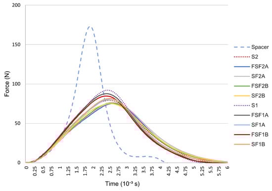 Although no significant difference was observed among the samples in their force absorption performance in terms of structure, thickness and fabrics, all of the textile–silicone composites and control samples show a higher percentage of impact force reduction than the spacer sample, with the largest differences being 43% and 41%, respectively, which indicates a better performance in impact absorption. This is in line with the results of Maurel et al. [], who modified a commercially available padded wrist guard by adding an additional gel layer, which led to an approximate 50% reduction in impact force. As shown in the force–time diagram in Figure 5, the inlaid spacer sample has the highest peak force in a relatively short period of time from absorbing the high impact force imposed by the ball bearing, whereas the textile–silicone composites and control samples with a silicone layer of 2 mm in thickness, either with SF or FSF structures, have the lowest peak force with a relatively long period of reaction time for force absorption. The reaction time required for the impact force absorption is similar among the textile–silicone composites and control samples. The extended time intervals indicate that the control samples and the textile–silicone composites have gradually absorbed the force and acted as an energy buffer against impact forces []. As is already known, silicone rubber has excellent elasticity and flexibility, which allows this material to absorb and dissipate impact forces effectively over large areas to reduce the transmittance of peak forces to the object. On the other hand, spacer fabric is a 3D textile, so its ability to absorb impact forces mainly depends on factors like the density of spacer threads and inlaid materials. Inlaid materials placed in an appropriate pattern with an adequate density can effectively absorb and decrease the impact forces for a satisfactory effect []. However, spacer fabric that incorporates silicone tubes as the inlaid material might not be able to evenly distribute and cushion or dissipate energy as compared to a pure silicone or silicone composite absorptive layer. Compared to the silicone samples, the incorporation of powernet fabric slightly enhances energy absorption. According to Auroy et al. [], the incorporation of a layer of glass fibre cloth reduces the shock-absorption capacity of silicone rubber, where the greater the hardness, the lower the shock-absorption capacity of silicone rubber. By using more elastic or resilient reinforced materials, the absorption capacity of silicone rubber can be increased. However, the effect of fabric was eliminated with the increase in silicone thickness. In terms of silicone thickness, the samples with 2 mm thick silicone have better shock-absorption behaviour regardless of whether the fabric is taken into consideration. With thicker material, more energy can be absorbed []. Therefore, a thicker absorptive layer has a higher force reduction capability.