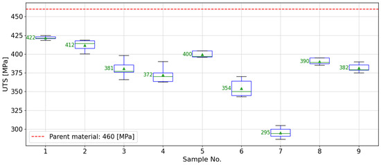 The aim of this study was to utilize the friction stir welding (FSW) technique for butt welding AA2024-T3 aluminum sheets with a thickness of 1.6 mm along the rolling line, spanning a length of 180 mm, employing a Makino PS95 machine. Table 1 presents the parameters of a commercially available tool utilized in the process. The preliminary welding parameters set a tool rotation speed of 1200 rpm and a welding speed of 160 mm/min, which constituted the central point of the experimental design. This was based on preliminary research into the FSW process. The welds produced under these conditions were devoid of defects and exhibited a strength of approximately 85% relative to the base material. To further investigate the possibility of enhancing the strength of the FSW joints, an examination around the central point was initiated by adding an additional 8 factorial points. Consequently, a 3 × 3 factorial experiment plan was developed, leading to a total of 9 welds executed under specific technological parameters as detailed in Table 2. The assessment of mechanical properties was carried out using a Zwick/Roell Z 100 universal testing machine (ZwickRoell, Ulm, Germany), following the ISO 6892:2020 standard [25]. For every set of technological parameters, 5 samples were prepared. The outcomes are summarized in Table 2, and the distribution of these results is depicted in a box plot with whiskers in Figure 1, providing a visual representation of the data’s variability and central tendency.