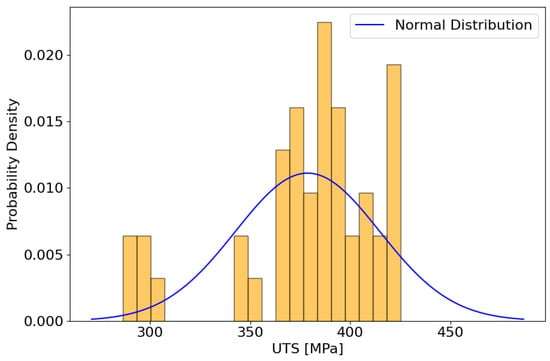 Histogram of ultimate tensile strength (UTS) values with a normal distribution curve.