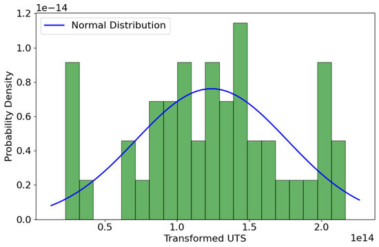 Box–Cox transformed ultimate tensile strength (UTS) values histogram with normal distribution curve.