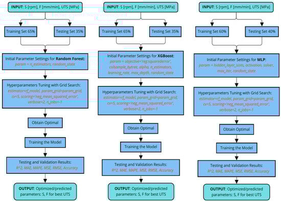 Figure 5 outlines the methodology utilized for optimizing friction stir welding (FSW) parameters using machine learning techniques. It demonstrates the workflow for three different predictive models: random forest (RF), XGBoost, and multilayer perceptron (MLP). For each model, the process begins with input parameters, including tool rotation speed (S in rpm), welding speed (F in mm/min), and ultimate tensile strength (UTS in MPa). The dataset is divided into a training set and a testing set.