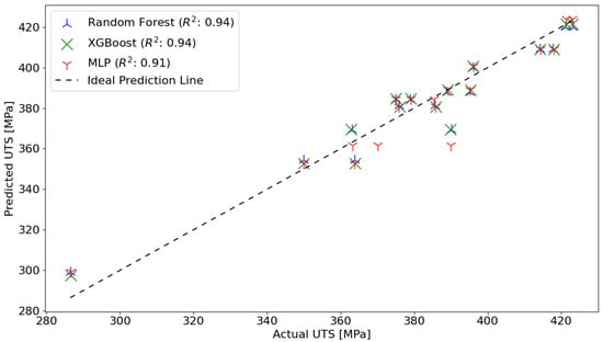 The scatter plots shown in Figure 6 provide a visual comparison of the actual ultimate tensile strength (UTS) values with those predicted by three different machine learning models: random forest (RF), XGBoost (XGB), and multilayer perceptron (MLP).