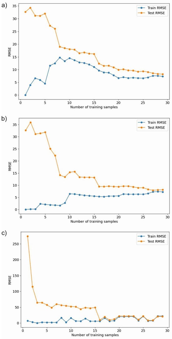 Analyzing the root mean squared error (RMSE) charts for three different machine learning models presents a comprehensive view of their performance across varying numbers of training samples. Figure 7a depicts the RMSE values for a random forest model. One observes that both training and test RMSE values decrease as the number of training samples increases. Notably, the test RMSE closely follows the training RMSE, suggesting that the model generalizes well. The RMSE values reach a level of stability after a certain number of training samples, indicating that the model achieves a state of equilibrium, where additional training samples do not significantly improve the model’s performance on the test set. Figure 7b presents the performance of an XGBoost model. Initially, the test RMSE is high but quickly converges towards the training RMSE with more training samples. A rapid decline in test RMSE with an increase in training samples suggests that the model benefits significantly from more data initially. The RMSE values for both training and test sets eventually stabilize, indicating a good fit without signs of overfitting or underfitting. Lastly, Figure 7c shows the RMSE values for an MLP-ANN model. Here, the test RMSE starts at a much higher value than the training RMSE, indicating potential overfitting when the number of training samples is limited. However, as more training samples are added, the test RMSE decreases, suggesting improved generalization. Despite this improvement, the test RMSE remains higher than the training RMSE throughout, which may imply that the model still overfits the training data to some extent.