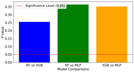 The comparison of p-values for predictive models indicates no statistically significant differences between random forest (RF), extreme gradient boosting (XGB), and multilayer perceptron (MLP) methods at the adopted significance level of 0.05.