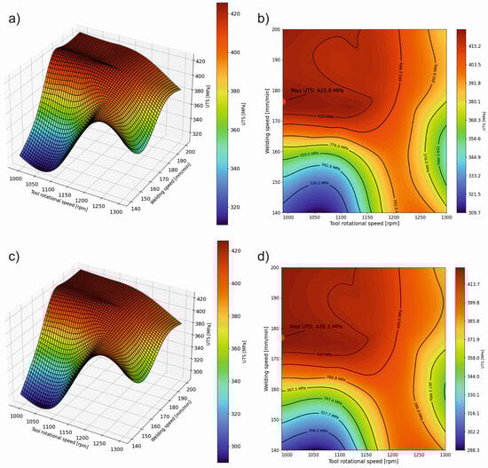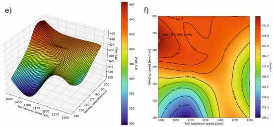 In Table 7, the optimized and extrapolated parameters obtained from the performed ML and ANN models are presented. The optimizations were conducted using a systematic parameter search method and leveraging trained ML and ANN models. The search algorithm utilizes predictions from ML and ANN models to iteratively enhance welding parameters towards maximizing the objective function, i.e., maximizing UTS. Response surfaces illustrating the influence of process parameters on UTS were constructed based on the developed ML and ANN models (Figure 9). Machine learning models RF and XGB present highly similar predictions. However, the MLP-ANN model exhibits certain differences despite employing regularization techniques. This may be due to decision trees performing significantly better with small input datasets (in our case, only 9 samples with 5 repetitions) compared to MLP-ANN. Additionally, the small dataset size contributes to a greater susceptibility to overfitting for MLP-ANN, as can be observed on the learning curve (Figure 7c), which is associated with their more complex structure. MLP may be more sensitive to the presence of nonlinearity in the data, whereas decision trees may better handle nonlinear dependencies due to their recursive nature of partitioning data into smaller subsets [44,45]. The differences in model performance for predicting the properties of FSW joints can be attributed to how each model handles the underlying complexity of the data, the balance between bias and variance, and their inherent algorithmic strengths and weaknesses. The optimal model choice depends on the specific requirements of the FSW process, the available data, and the desired balance between prediction accuracy and model interpretability.