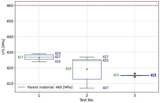 Box plot representation of the ultimate tensile strength (UTS) test results for friction stir welded butt joints of 1.6 mm thick 2024-T3 aluminum alloy sheets. The plot illustrates the spread of results across five specimens prepared from each welded sample, showcasing the variability in UTS measurements.
