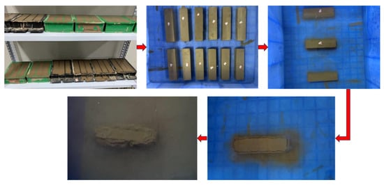 Based on the UCS test method in JTG E51-2009 [20] “Test Methods of Materials Stabilized with Inorganic Binders for Highway Engineering”, specimens were dried and coated with epoxy resin on 5 sides to prevent water penetration, leaving only 1 bottom side for the water absorption test (Figure 4). Prior to testing, the initial weight of the specimen (M0) was recorded. During the test, the specimens were removed at specific intervals (5 min between 0 and 60 min, 15 min between 60 and 360 min, and 30 min between 360 and 540 min) to measure their weight. Excess water from the surface of the specimen was wiped away before weighing it until its mass no longer changed, which is referred to as the saturation mass (M1). The water absorption can then be determined as follows: