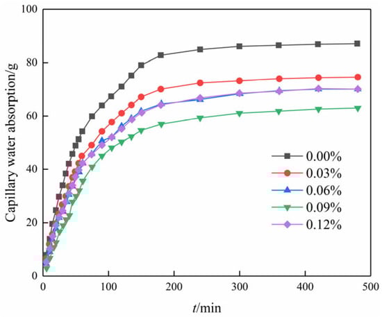 Table 6 lists the capillary water absorption rates of the modified cemented soils at different time intervals. It clearly demonstrates that the inclusion of GO leads to a significant reduction in the capillary water absorption rates of the cemented soils across different stages. The inclusion of GO at content levels of 0.03%, 0.06%, 0.09%, and 0.12% resulted in water absorption rate reductions of 16.5%, 21.3%, 33.9%, and 22.3%, respectively, compared to the blank specimens. It is seen that GO content had a significant effect on the water absorption rate and also showed the threshold characteristic. When the content was 0.09%, GO had the greatest effect on the capillary water absorption rate and the most obvious reduction.