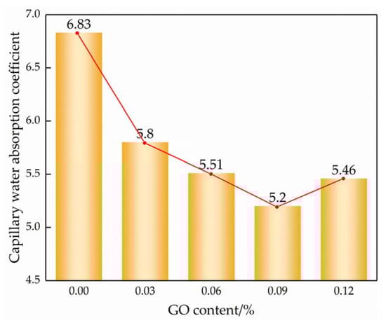 Moreover, the capillary water absorption showed a trend of decreasing and then increasing with the increase in GO content in the same period, and the water absorption was the smallest when the content was 0.09%. The saturation water absorption decreased by 28.3% in comparison to the blank specimen. The inclusion of GO influenced the compact aggregation of crystals, leading to a tendency for further densification and interweaving. Therefore, adding GO to the soil–cement matrix resulted in a decrease in the pore volume in the soil sample and the formation of a compact structure [27]. Subsequently, the water absorption increased rather than decreased with an increase in the content of GO. This is attributed to inadequate dispersion within the matrix at excessive levels of GO doping, thus compromising its reinforcing effect on the matrix material [28].