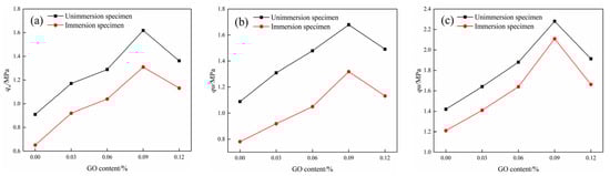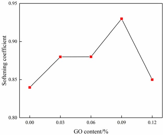 According to Equation (3), the variation in the softening coefficient as a function of GO content can be further obtained, as shown in Figure 12. It clearly illustrates that the softening coefficient exhibited a gradual increase as the GO content was raised from 0% to 0.09%, resulting in increases of 4.76%, 4.76%, and 10.16% when compared to the blank specimens. Nevertheless, the softening coefficient shows a downward trend beyond a GO content of 0.09%, suggesting that a suitable amount of GO can greatly enhance the water resistance of cemented soil [31].
