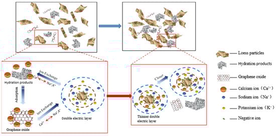 In addition, the soil particle colloids are negatively charged and have substantial amounts of adsorbed K+ and Na+ on their surfaces. The addition of cement resulted in the production of Ca2+ during the hydration process. The Ca2+ ions undergo cation exchange with the K+ and Na+ ions present on the surface of soil particles. This exchange leads to a decrease in the thickness of the double electric layer and an increase in the bonding force between the soil particles. As a result, the microstructure of the soil experienced some improvement. Furthermore, the addition of GO greatly stimulates the cement hydration reaction, resulting in the generation of a substantial quantity of hydration products and Ca2+. This further enhances the exchange of Ca2+ with K+ and Na+ on the surface of the soil particles, resulting in a more pronounced thinning of the soil particles’ double electric layer and a significant increase in the bonding force between them (see Figure 15). This results in a stronger and denser overall structure, leading to a significant improvement in water resistance and mechanical properties [39].