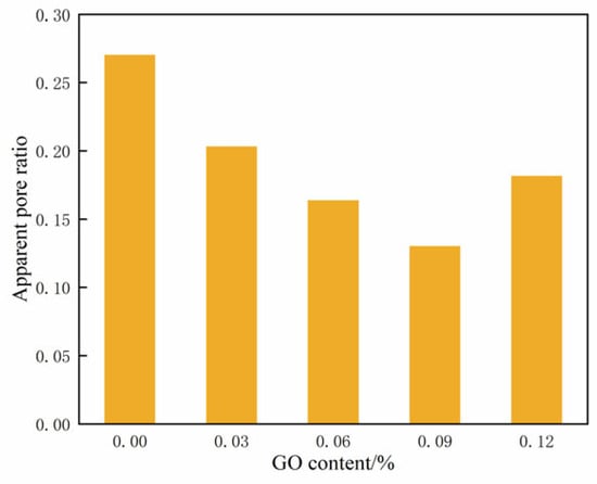 Figure 16 displays the changes in the apparent pore ratio across varying contents of GO. It illustrates that the apparent pore ratio of the specimens initially decreased and then increased as the GO content increased. At a content of 0.09% GO, the apparent pore ratio reached its minimum value, indicating the highest level of compaction in the cemented soil.