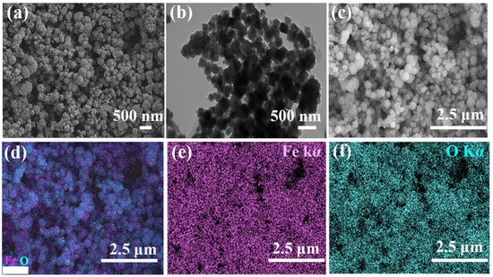 (a) SEM image of magnetic Fe3O4; (b) TEM image of magnetic Fe3O4; (c–f) SEM and EDS elemental elemental mapping (Fe Kα and O Kα) of magnetic Fe3O4.