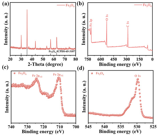 (a) XRD of magnetic Fe3O; (b) XPS survey spectrum of magnetic Fe3O4; (c) high-resolution Fe 2p of magnetic Fe3O4; (d) high-resolution O 1s of magnetic Fe3O4.