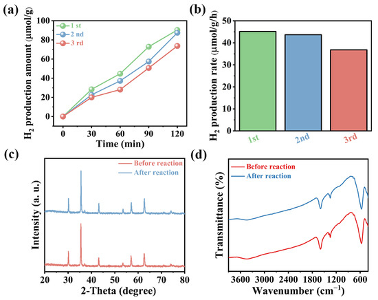 (a) Time profiles of sonocatalytic H2 production by Fe3O4 under 3 cycles (reaction conditions are as follows: ultrasonic frequences = 50 kHz, ultrasonic powers = 240 W, and sacrificial agent = MeOH); (b) H2 production rates of Fe3O4 after 3 cycles (reaction conditions are as follows: ultrasonic frequences = 50 kHz, ultrasonic powers = 240 W, and sacrificial agent = MeOH); (c) the XRD spectra over magnetic Fe3O4 before and after sonocatalytic water splitting reactions; (d) the FT-IR spectra over magnetic Fe3O4 before and after sonocatalytic water splitting reactions.