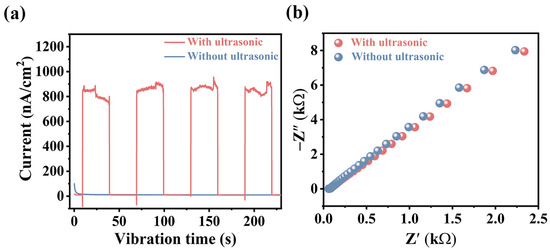 (a) Current obtained from magnetic Fe3O4 under ultrasonic or without ultrasonic vibration; (b) EIS plots obtained from magnetic Fe3O4 under ultrasonic or without ultrasonic vibration.