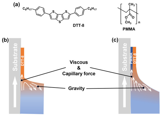 (a) Molecular structures of DTT-8 and PMMA. Schematic illustration of dip-coating process at the meniscus-controlled regime for pure DTT-8 solution (b) and the entrainment-controlled regime for DTT-8:PMMA blending solution (c).