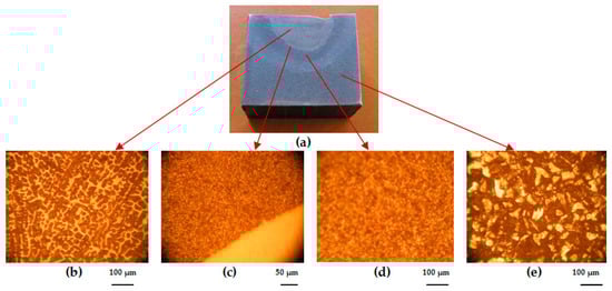 Macro- and microstructural analysis images of the loaded area: (a) plate macrostructure; (b) deposited material (DM), 100× magnification—casting structure for martensite with residual austenite and complex carbides evenly distributed; (c) transition area (TA), 50× magnification—complete melting without damage; (d) heat-affected area (HAZ), 100× magnification—martensite and bainite; (e) base material (BM), 100× magnification—recurrence structure.