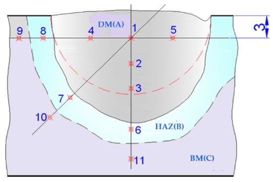 Specific areas for measuring the hardness of metal deposited by welding. Note: The dotted red line shows the semicircular milled groove for welding surface preparation. The points 1–11 indicate where the hardness was measured.
