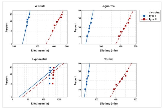 The estimated adjusted Anderson–Darling statistics (AD*) were comparable, with the only exception being the exponential distribution (Table 4). For the purpose of punctual estimation of the parameters’ distribution, we considered the Weibull distribution because it provided the best fit for the two types of dies.