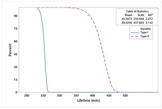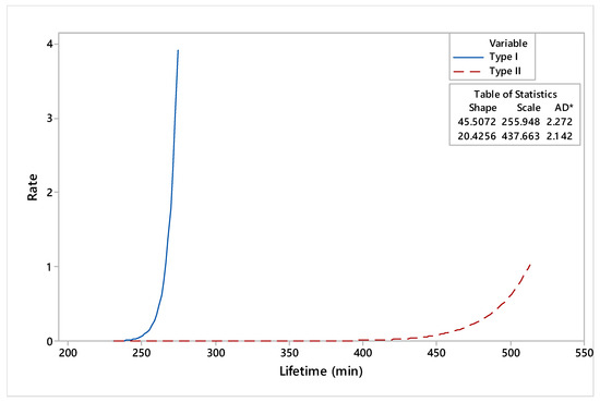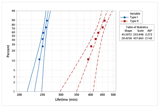 It can be underlined that shape and scale parameters for type II dies are significantly higher than in the case of type I dies. Regarding the mean time to failure (MTTF) for dies refurbished by deposition welding, it can be pointed out that the estimated value was 426.28 min compared to 252.82 min recorded for dies manufactured by conventional processes. In addition, the estimated values for the MTTF and median were similar in the case of the dies under study. Compared to type II, the standard deviation of type I dies was lower, indicating a statistical stability of lifetimes.
