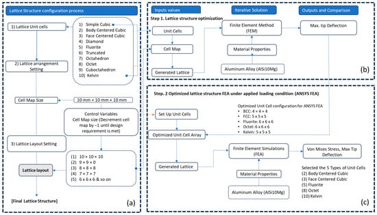 Lattice configuration optimization method and general study framework, (a) Lattice generation and configuration, (b) Arrangement optimization, (c) FEA simulation.