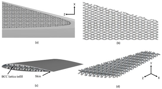 4 × 4 × 4 mm BCC lattice-infilled wing, (a,b) represents the plain view, (c,d) showing the isometric view with and without skin.