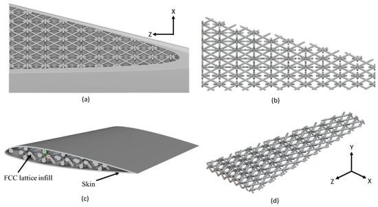 5 × 5 × 5 mm FCC lattice-infilled wing, (a,b) represents the plain view, (c,d) showing the isometric view with and without skin.