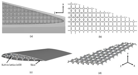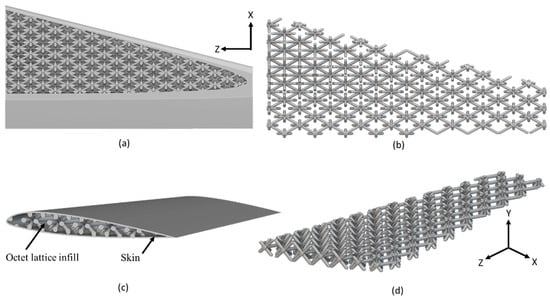 6 × 6 × 6 mm Octet lattice-infilled wing, (a,b) represents the plain view, (c,d) showing the isometric view with and without skin.