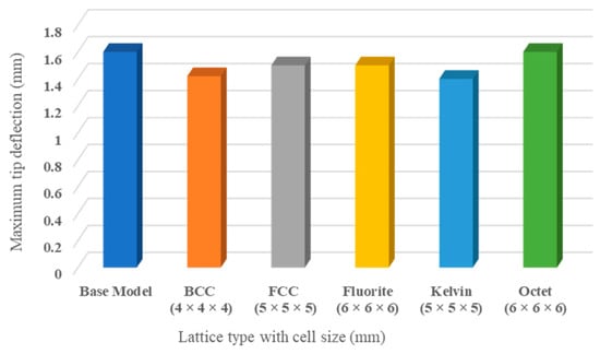 Furthermore, linear elastic analyses of wing structures are presented in Figure 18 and Figure 19, where the deflection behavior of lattice-infilled wing structures is shown. As can be observed, the wing-tip deflection changes based on changing unit cell type and cell size. The comparatively less deflection in the case of the BCC (Figure 18b) and Kelvin (Figure 18e) lattice structures can be observed compared to the rest of the lattice structures. This establishes the dependency of tip deflection upon the lattice type and its arrangement in the design space.