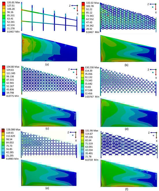 Stress distribution for (a) Base-wing model, (b) BCC lattice infill, (c) FCC lattice infill, (d) Fluorite lattice infill, (e) Kelvin lattice infill and (f) Octet lattice infill.