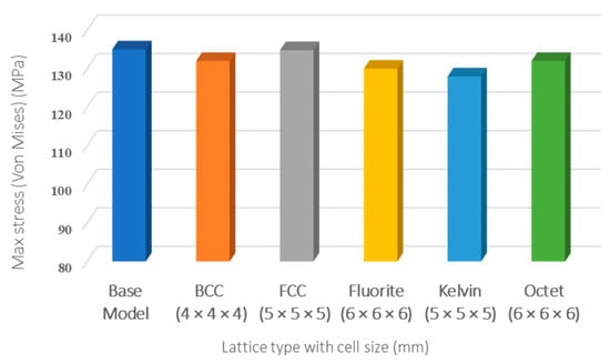 Investigations of the stress distribution and concentration among different types of optimized lattice-infilled wing structures were performed through linear elastic FEA on the ANSYS workbench. Figure 20 shows the stress distribution of each lattice structure and highlights that the stress distribution is dependent on the unit cell topology and its arrangement in the design space. It can be observed that the stress is uniformly distributed in the infilled lattice compared to the base-wing model, where the stress peak occurred in the spar end area (Figure 20a). This is due to the fact that in the lattice structure, the stress is carried by the distributed unit cells before passing into the entire structure. Among all lattices, the behavior of Fluorite, Kelvin, BCC, and Octet infilled lattice structures is better compared to the rest of the lattices. A lower maximum stress value of 128 MPa was reported for Kelvin followed by Fluorite with a maximum value of around 130 MPa. A higher stress value of around 134.8 MPa was recorded for FCC closely equals the peak stress of the base wing. The stress value for BCC and Octet lattice structure was around 132 MPa. A comparison of stress distribution over the skin can also be made from Figure 20. There is almost a similar distribution over the wing structure skin, with more stresses at the wing box area near the root, lowering towards the tip of the wing. BCC, FCC, and Octet infilled-structure skins were observed with a peak of stresses, as can be seen in Figure 20b,c,f. These stress peaks are presumed to be due to the open beam tips connected to the skin from the inside, causing stress concentration at the joint between the skin and the lattice beam. Furthermore, Figure 21 summarizes the peak values of stress measured for different types of lattice-infilled structures. All the stress values are within the design stress < 167 MPa (FoS 1.5), and the wing designs are considered safer. The relatively poor behavior of FCC may be due to the unit cell topology, where all the beams are connected to a single point on the face of the unit cell called a node, creating more stress concentration in the FCC unit cell type. More explanation of stress concentration is provided in the next section.