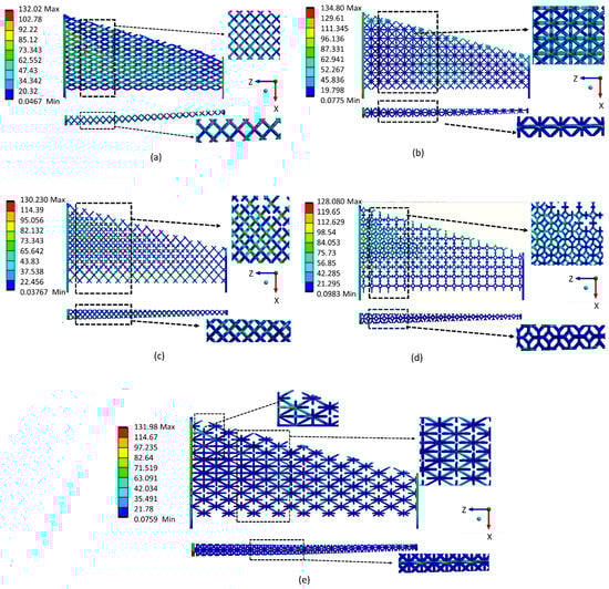 Stress concentration at different locations of optimized lattice-infilled structures, (a) BCC lattice infill, (b) FCC lattice infill, (c) Fluorite lattice infill, (d) Kelvin lattice infill and (e) Octet lattice infill.