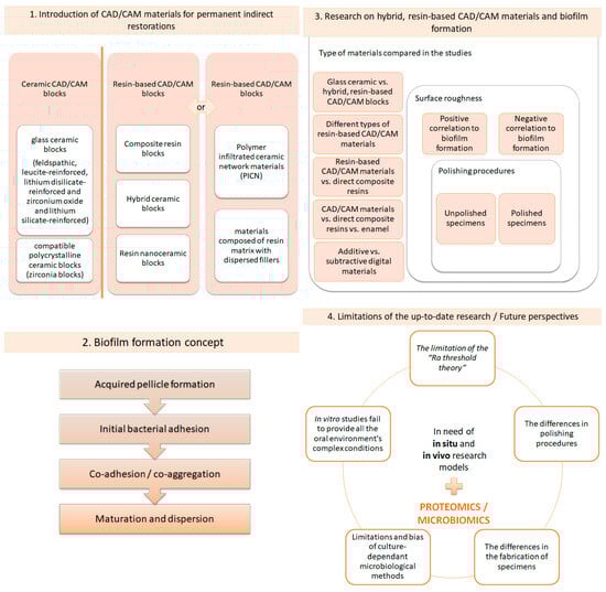 Through the years, researchers have constantly evaluated the mechanical properties of hybrid, ceramic, resin-based CAD/CAM blocks. The flexural strength, Vickers hardness and elastic modulus are of utmost importance for excellent clinical performance. Surface properties, such as the surface roughness and surface topography, have also been investigated, but to a lesser extent compared to mechanical properties [,,,,,,,,,,]. Unfortunately, scarce evidence exists concerning bacterial attachment and subsequent biofilm formation on hybrid ceramic, resin-based CAD/CAM blocks for permanent, indirect restorations, meaning that this is a field that needs further investigation. Biofilm formation is a potential causative factor facilitating restoration failure since it promotes the appearance of secondary caries on the restoration’s margins and provokes biodegradation, thus altering the restorative material’s surface characteristics [,]. To the best of our knowledge, until recently, no critical reviews of the existing literature focusing on bacterial formation on CAD/CAM dental materials for indirect restorations have been published, and a comprehensive evaluation of the methodology, observations and results of current research protocols is lacking. Therefore, the aims of this review are, firstly, to introduce the resin-based CAD/CAM materials used for single indirect restorations and to present the recent data concerning biofilm formation on their surfaces, and secondly, to shed light on the methodological patterns used, as well as their limitations. Furthermore, future directions in microbiome analysis will be highlighted. A visualization of the structure of this comprehensive review is presented in Figure 1.