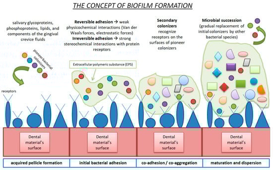 When the distance between the bacteria and the surface is 20 to 100 nm, van der Waals forces and electrostatic interactions are of utmost importance for cell attachment. Lastly, when the distance is short (<20 nm), biofilm attachment due to nonspecific and specific bonding mechanisms is observed. Signaling transactions, as well as activation of specific transmembrane receptors, are examples of specific bonding mechanisms. After the arrival of microorganisms, bacterial attachment commences and pioneer colonizers are established []. The initial binding is reversible due to the weak physicochemical interactions (van der Waals and electrostatic forces). The next step is the irreversible phase, where strong stereochemical interactions between microbial adhesins and receptors on the acquired pellicle occur. Adhesins expressed by secondary colonizers recognize receptors on the surfaces of pioneer colonizers, and the co-aggregation or co-adhesion phase takes place. Microbial succession, meaning the gradual replacement of initial colonizers by other bacterial species through the initial bacteria’s metabolic process, follows, and mature dental plaque is built [,]. Figure 2 briefly describes the dental plaque formation stages.