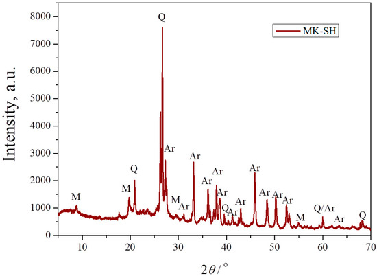 XRPD pattern of a mixture of metakaolin and seashells (MK–SH) with anorthite stoichiometry: Q—quartz, M—muscovite, Ar—aragonite.