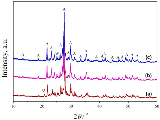 XRPD patterns of crushed samples of powder compacts containing no banana peel, obtained after 2 h long sintering at different temperatures: (a) 1100 °C, (b) 1150 °C and (c) 1200 °C. A—anorthite, Q—quartz, W—wollastonite.
