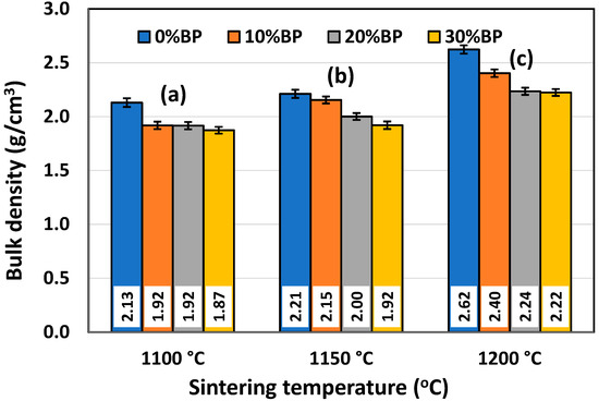 Bulk density of anorthite ceramics containing different amounts of banana peel (BP), obtained after 2 h long sintering at different temperatures: (a) 1100 °C, (b) 1150 °C and (c) 1200 °C. Theoretical density (TD) of anorthite is 2.76 g/cm3.