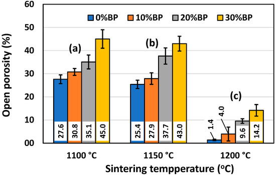 Open porosity of anorthite ceramics containing different amounts of banana peel (BP), obtained after 2 h long sintering at different temperatures: (a) 1100 °C, (b) 1150 °C and (c) 1200 °C.