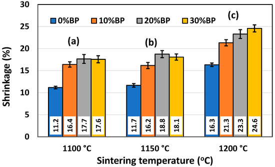 The shrinkage of powder compacts consisting of metakaolin, seashells and different amounts of banana peel was measured after sintering. Figure 7 shows the effect of sintering temperature on the shrinkage of samples containing different amounts of banana peel. Obviously, the increase in the sintering temperature from 1100 °C to 1200 °C led to a shrinkage increase due to the faster sintering process occurring at a high temperature. It is important to point out that the shrinkage values for samples sintered at 1100 °C and 1150 °C are quite similar, ranging from ~11.17% in samples without banana peel sintered at 1100 °C to 18.75% in samples containing 30 wt% banana peel sintered at 1150 °C. A somewhat larger shrinkage was measured after sintering at 1200 °C. The values ranged from 16.33% in samples without banana peel to 24.59% in samples containing 30 wt% banana peel. The large shrinkage of samples containing 30 wt% banana peel sintered at 1200 °C was the result of both the high sintering temperature and considerable porosity created due to pore former burnout, which takes place at a temperature lower than the sintering temperature. The elimination of this porosity during the sintering process causes a significant consolidation and, therefore, shrinkage of the samples.