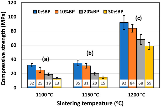 Compressive strength of anorthite ceramics containing different amounts of banana peel (BP), obtained after 2 h long sintering at different temperatures: (a) 1100 °C, (b) 1150 °C and (c) 1200 °C.
