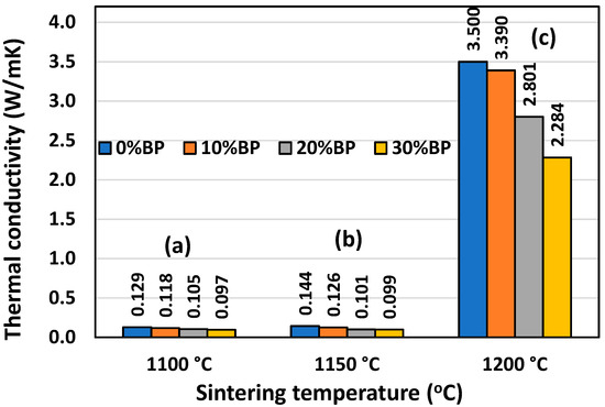 Thermal conductivity of anorthite ceramics containing different amounts of banana peel (BP), obtained after 2 h long sintering at different temperatures: (a) 1100 °C, (b) 1150 °C and (c) 1200 °C. Error bars are not presented (visible) due to very small standard deviation.