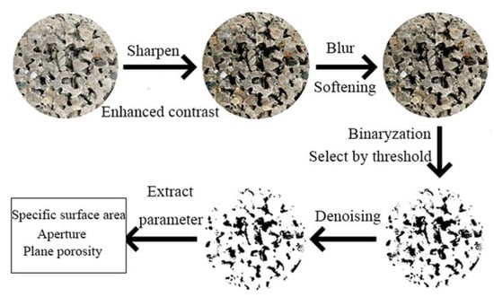 The pervious concrete blocks were cut into eight equal parts using an HQP-150 concrete core sample block cutter (Beijing Zhongbo Ruike Testing Equipment Co., Ltd., Beijing, China). Then, a high-resolution camera was used to capture images of the sections. The captured images were exported to the ImageJ processing software (1.53i). Various operations, such as sharpening, smoothing, and enhancing contrast, were performed to enhance the distinction between the pores and solid parts in the image. The binarization method was adopted, and the grayscale value of the pixels in the image was set to 0 or 255, i.e., the whole image presented a clear black-and-white visual effect to achieve the best view. Consequently, a binary image of the cross-section diagram was obtained, revealing the internal microscopic features of the pervious concrete specimens with different mixing ratios. This process is illustrated in Figure 1.