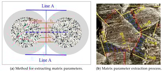 The pervious concrete used in this study was cut into 10 mm slices and polished on each side before the slices were photographed for calculation. Then, the bonded areas—the cement paste zones that directly connected adjoining aggregates—were manually determined for each section. To assess these bonded regions, line D was initially drawn to indicate the closest distance between neighboring aggregates. Subsequently, two straight lines, A and B, were drawn parallel to D. Lines A and B were tangent and orthogonal to the contour of the aggregate, respectively. A perpendicular line that intersected with D was also drawn and labeled as Lmin. The width of the contact zone, denoted as L, was measured by considering the portion of line L lying in the cement paste; this zone was between lines A and B. Next, to determine the matrix thickness between two neighboring aggregates, five parallel lines (t1–t5) were manually drawn to perpendicularly intersect with line L; these lines equally divided line Lmin into six equal intervals. The length of each line within the bonded area was recorded. The average length was used to define the matrix thickness between two adjacent aggregates, as illustrated in Figure 3a. This methodology was employed for each section of the pervious concrete (Figure 3b). The number of matrices, their thickness, and their width were then tallied to obtain the average values.