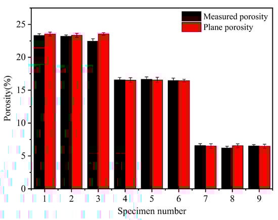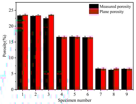 The measurement of a specimen’s plane porosity involved processing a section of the pore area and calculating the ratio of the pore area to the full area of the section. The average value of the porosity in each section was then obtained to yield the specimen’s plane porosity. As shown in Figure 4, the measured porosity and planar porosity obtained by processing the cross-section diagrams were consistent. This indicated that the microscopic parameters obtained through this approach had a certain level of reliability. Additionally, the porosity of the pervious concrete specimens remained similar when the ash set ratio was the same and the grain size was different. This suggested that the aggregate grain size had a negligible effect on the porosity of the pervious concrete.