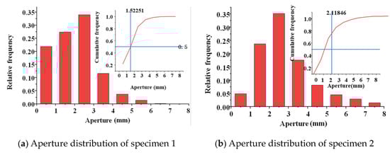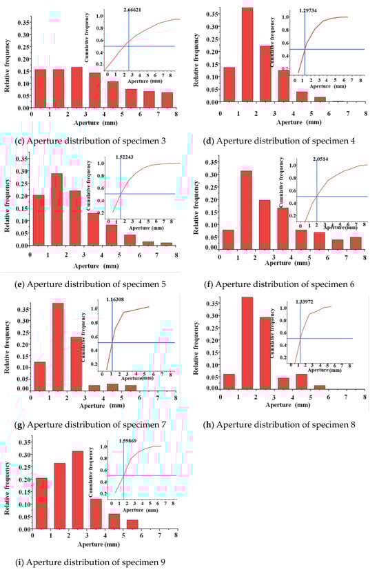 A frequency histogram of the pore size and particle size distributions of the specimens is shown in Figure 5. The figure indicates that the pore size of the pervious concrete increased with the aggregate size when the ash set ratio remained constant. For specimens with a cement content of 20% and an aggregate particle size of 2.36–4.75 mm, the pore size was concentrated in the range of 1–3 mm. For specimens with an aggregate particle size of 4.75–9.5 mm, the pore size was mainly distributed in the range of 1–4 mm. Furthermore, specimens with aggregate particle sizes in the range of 9.5–16 mm predominantly exhibited pore sizes ranging from 2 to 6 mm. This trend in the pore size distribution was mainly observed in the specimens with cement contents of 30% and 40%. Moreover, increasing the cement content increased the bonding among aggregates, thus dividing the original large and interconnected pores into smaller ones. Consequently, the pore size of the pervious concrete specimens gradually decreased with the increase in the cement content. This was because the increase in the cement content provided enough slurry to cover the surface of the aggregate and fill the voids between the aggregates. To represent the pore sizes of the pervious concrete specimens, the total frequency distribution of the pore size was plotted while considering a pore size with a 50% distribution frequency.